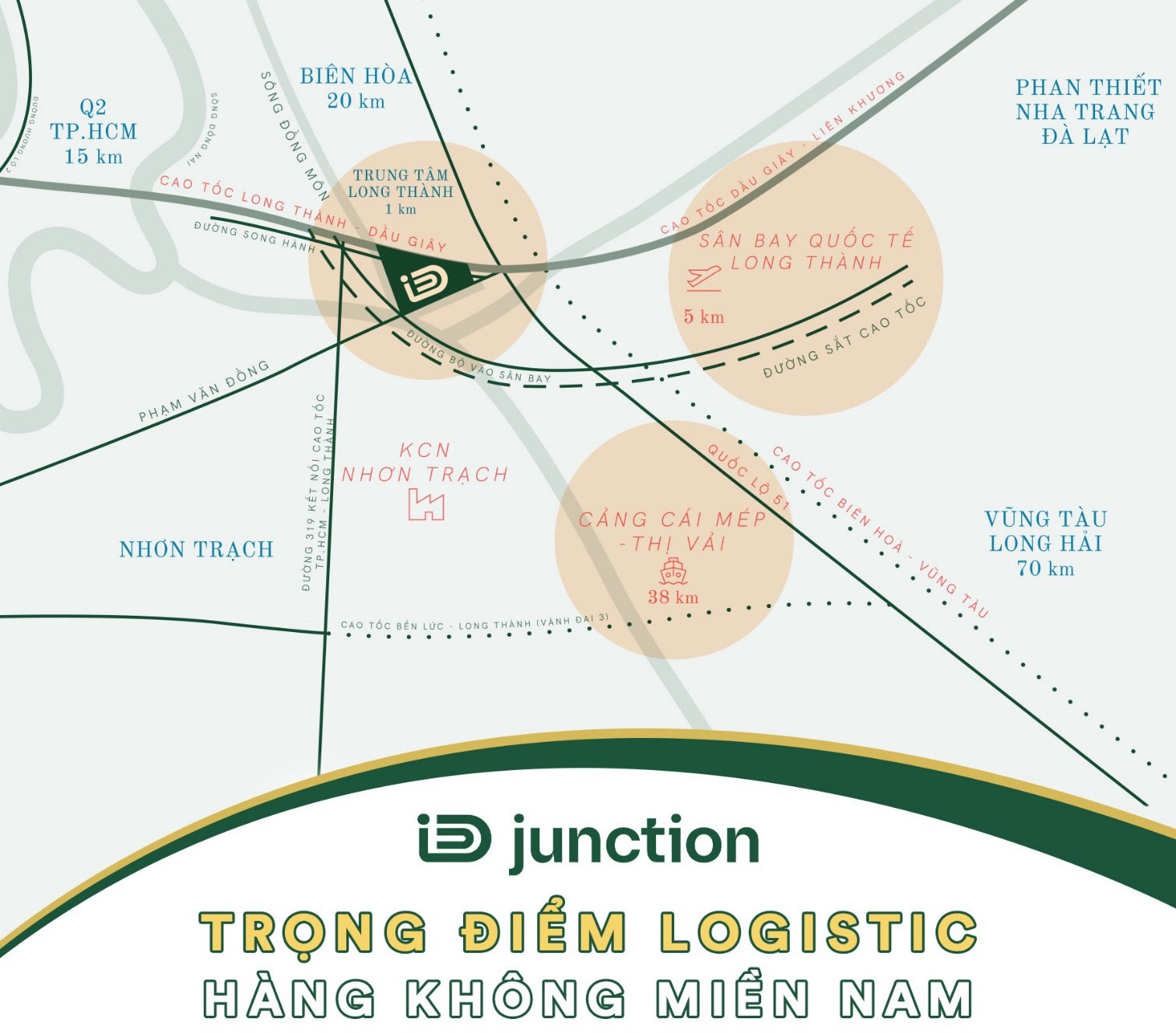 Nằm ngay tam giác vàng logistics tương lai của cả miền Nam, thông thương quốc tế, ID Junction Long Thành kết nối với các tiện ích ngoại khu trong bán kính 2km, cách Chợ Mới 1km, trung tâm thương mại Vincom 1 km và trung tâm hành chính Long Thành 2km, cư dân có thể thuận tiện di chuyển, đáp ứng mọi nhu cầu sinh hoạt hàng ngày.