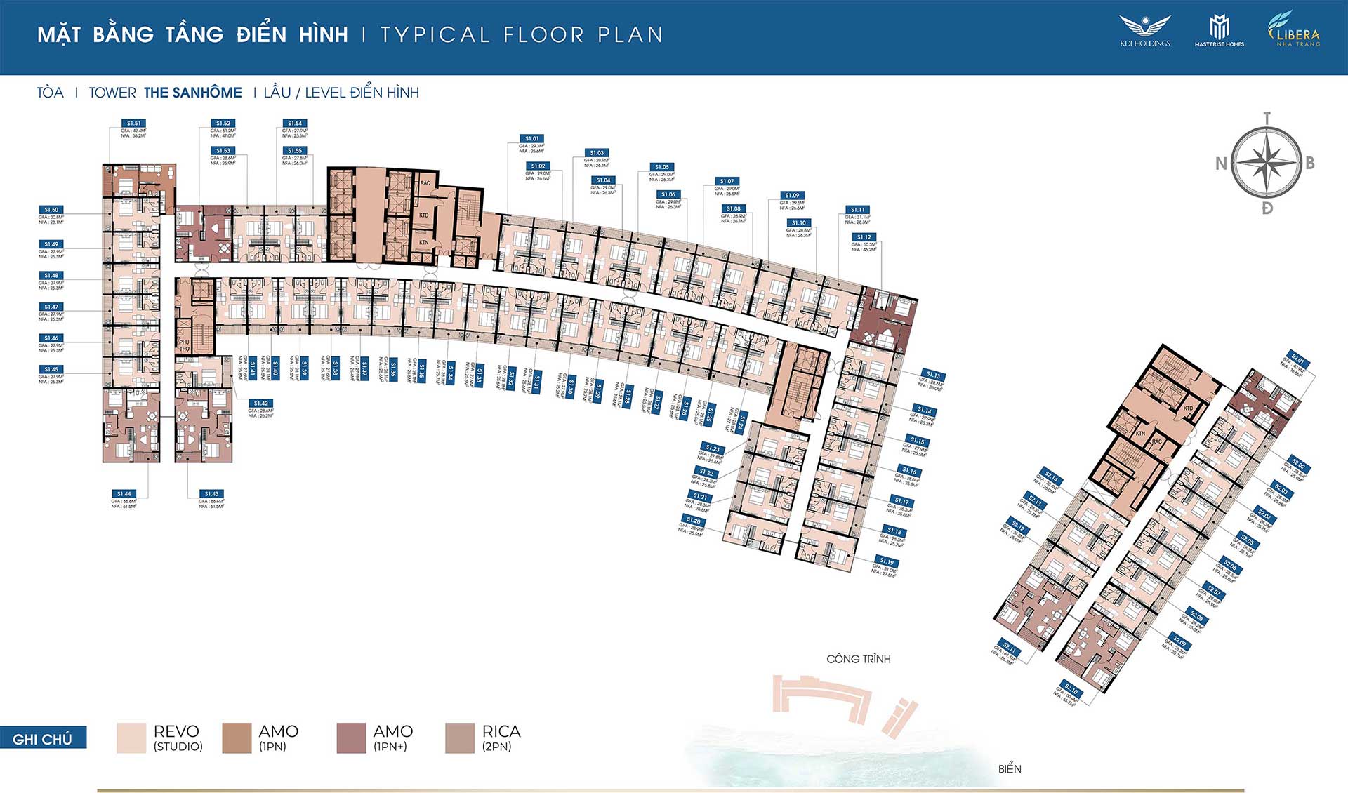 Mặt bằng tòa căn hộ The Sanhome tại Libera Nha Trang gồm 2 tòa tháp cao 30 tầng với số lượng 1975 căn hộ biển và 27 căn shophouse