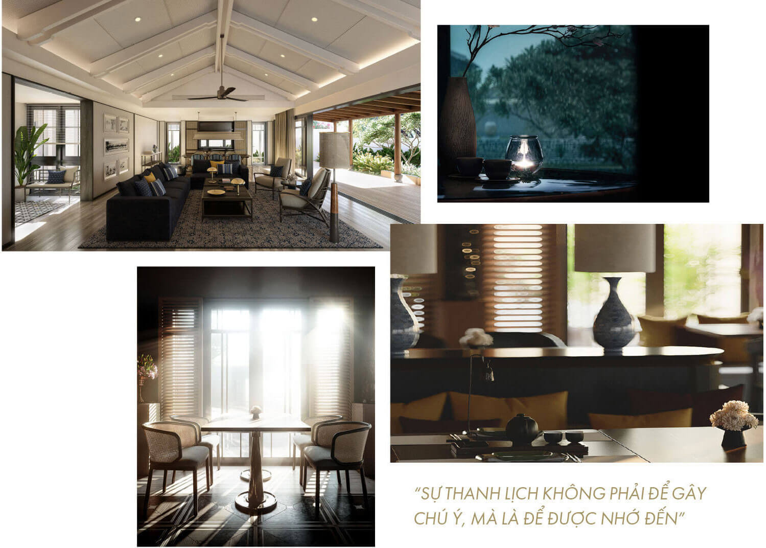 Những dinh thự này tọa lạc trong một quần thể nghỉ dưỡng ven biển, bởi vậy, cảm giác sang trọng không được gợi lên từ những vật liệu đắt tiền, dát vàng dát bạc. Thay vào đó, chúng tôi tập trung tuyển chọn và sử dụng những vật liệu địa phương và các bộ môn thủ công truyền thống, kết hợp nhuần nhuyễn với ngôn ngữ đương đại để tạo ra một không gian sống thanh lịch mà không phô trương giữa những tầng lớp họa tiết và hoa văn thấm đẫm hồn Việt.