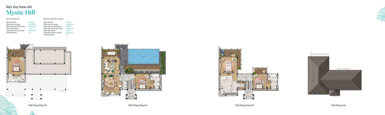 - Biệt thực sườn đồi: 16 căn diện tích 368m2 có 4 phòng ngủ, có hồ bơi riêng, có hầm.