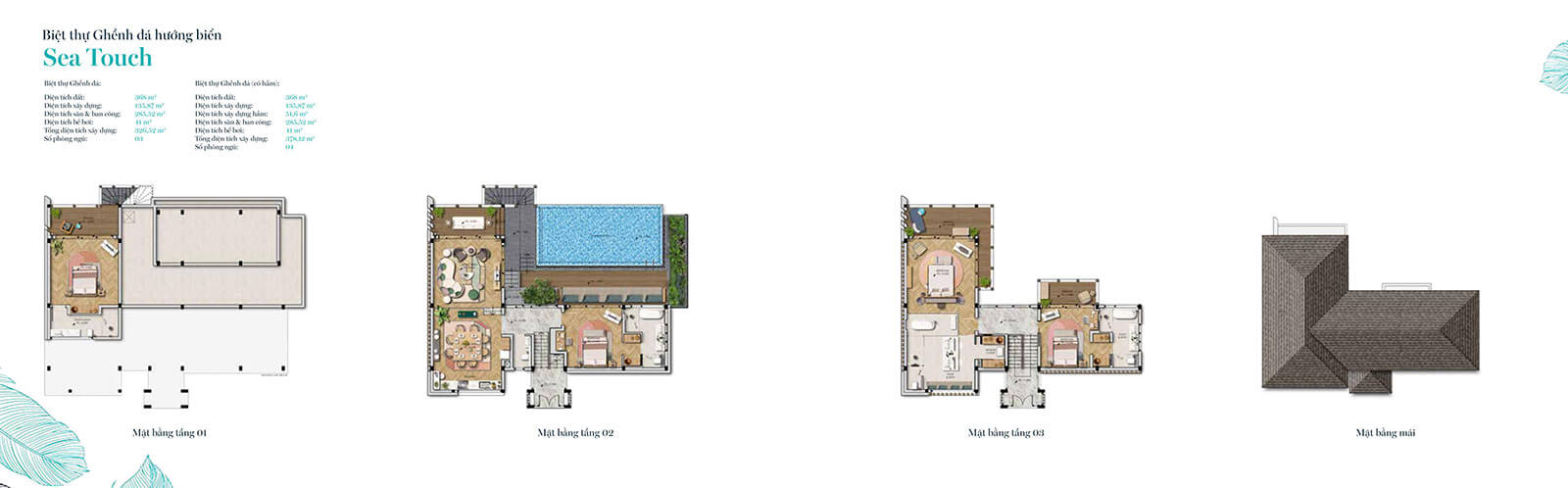 - Biệt thự ghềnh đá ( Sea Touch ): 17 căn diện tích 368m2 có 4 phòng ngủ, có hồ bơi riêng, có hầm.